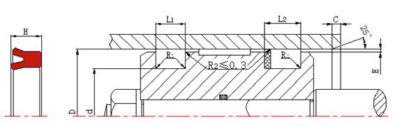 缸徑 D H9 溝槽底徑 d h9 H 槽寬L1 +0.2 槽寬L2 +0.2 R1≤ C≥