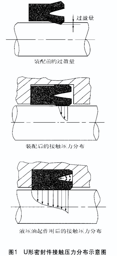 唇形密封件是指受壓呈唇形并具有壓力強(qiáng)化密封作用的一類(lèi)密封件或襯墊。其結(jié)構(gòu)形式很多,除標(biāo)準(zhǔn)的V形、U形、Y形、L形和J形外,還有由這些形狀演變而來(lái)的各種特殊形狀。唇形密封件的密封原理是依靠密封件唇口與配合面之間的過(guò)盈量和工作介質(zhì)的壓力使唇形密封件產(chǎn)生彈性變形,以封堵相對(duì)運(yùn)動(dòng)兩零件之間的間隙,達(dá)到密封的目的。圖1是U形往復(fù)運(yùn)動(dòng)密封件( U形密封件是油壓缸中使用廣泛的油封,它是一種典型的唇口密封件,無(wú)論用于活塞或是活塞桿都能獲得良好的密封效果。主要應(yīng)用于重載行走機(jī)械或工業(yè)液壓中的活塞或活塞桿密封。)裝配和接觸壓力的分布示意圖,密封件裝入安裝槽時(shí)內(nèi)唇口與桿件相接觸發(fā)生變形,當(dāng)液壓油加壓后其整個(gè)滑動(dòng)面與桿件的表面完全貼合在一起。