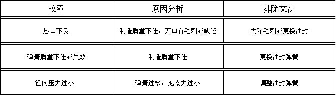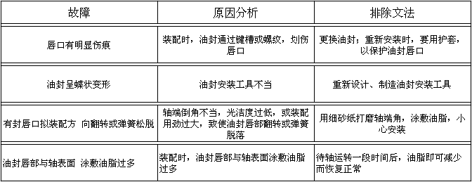 骨架油封屬于動密封元件,“臨界油膜”的存在,是油封密封的必要條件,無泄漏的密封是不允許的,也是不可能的。因為潤滑油膜的存在是保證油封刃口實現潤滑摩擦鎖必不可缺的,而潤滑油膜的存在,使得一定量的泄漏不可避免。對旋轉用油封,在使用過程中,如果在運行初期的50~100小時之內發生微量的泄漏是允許的。隨著運轉時間的加長,泄漏會逐漸停止,往往這樣的油封壽命比較長。在有效使用期限內,微量的泄漏是允許的,否則,必須按照下述油封的常見故障原因及排除方法進行處理。