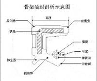 骨架油封結構有三部分組成:油封體、加強骨架和自緊螺旋彈簧。密封體按照不同部位又分為底部、腰部、刃口和密封唇等。通常,在自由狀態下的骨架油封,其內徑比軸徑小,即具有一定的“過盈量”。因此,當油封裝入油封座和軸上之后,油封刃口的壓力和自緊螺旋彈簧的收縮力對軸產生一定的徑向緊力,經過一段時間運行后,該壓力會迅速減小乃至消失,因而,加上彈簧可以隨時補償油封自緊力。