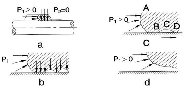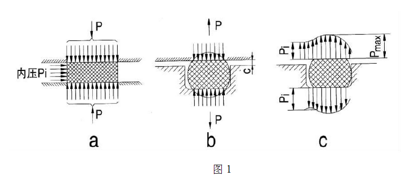 O型密封圈用做往復(fù)運(yùn)動(dòng)密封時(shí),其預(yù)密封效果和自密封作用與靜密封一樣。但由于桿運(yùn)動(dòng)時(shí)很容易將流體帶到O型密封圈和桿之間,因此,情況比靜密封復(fù)雜,假設(shè)流體為潤滑油,壓力只作用于其接觸O型密封圈一側(cè)(圖3 a),若將O型密封圈與桿接觸部位放大(圖3 b)其接觸表面實(shí)際上是凹凸不平的,并非每一點(diǎn)都與金屬表面接觸。O型密封圈左方作用著油壓Pi。由于自封作用的存在,O型密封圈對(duì)桿產(chǎn)生的接觸壓力大于Pi 而密封。但當(dāng)自桿開始向右運(yùn)動(dòng)時(shí),粘附在桿上的油被帶到楔形狹縫(圖3 c),由于流體動(dòng)壓效應(yīng),這部分油的壓力比Pi 大,當(dāng)它大于O型密封圈對(duì)桿的接觸壓力時(shí),油便擠入O型密封圈的凹處(圖3 d),桿繼續(xù)向右滑動(dòng),油又進(jìn)入下一凹處,依次向右推移,油便沿著桿運(yùn)動(dòng)的方向泄露。當(dāng)桿向左運(yùn)動(dòng)時(shí),由于桿運(yùn)動(dòng)方向與桿壓力方向相反,故不易泄露。